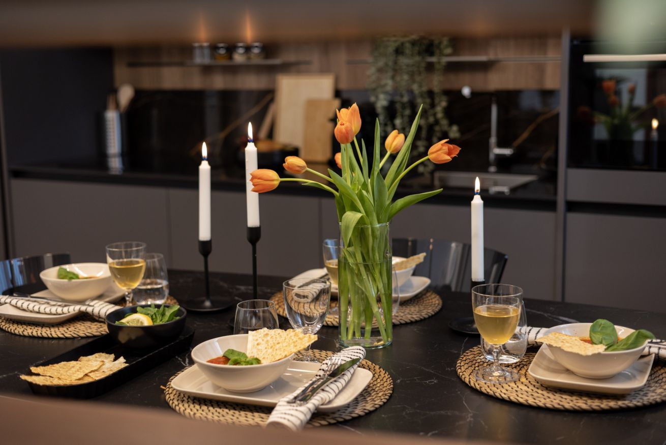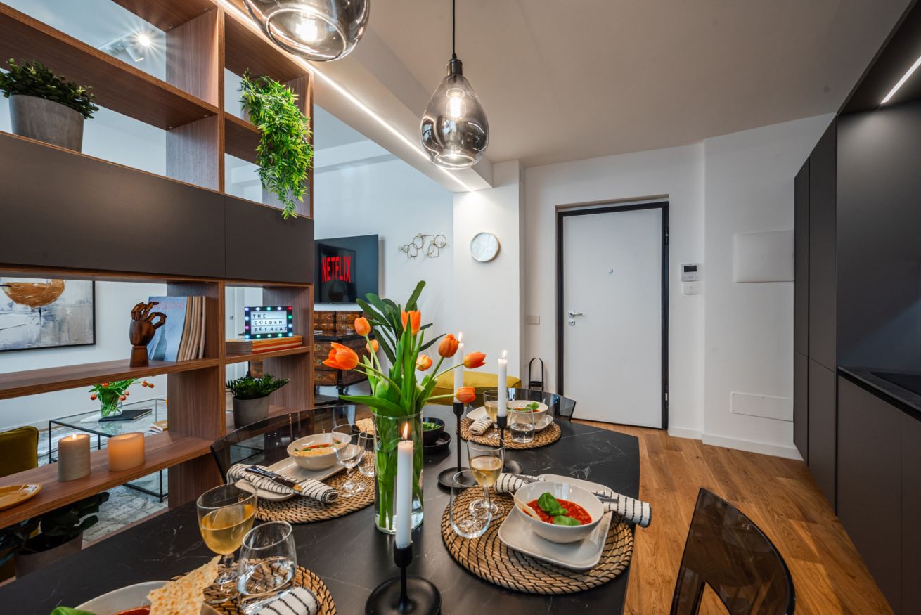 ・Zona living/dining con cucina a vista completamente attrezzata, tavolo da pranzo moderno e grande divano letto e TV