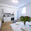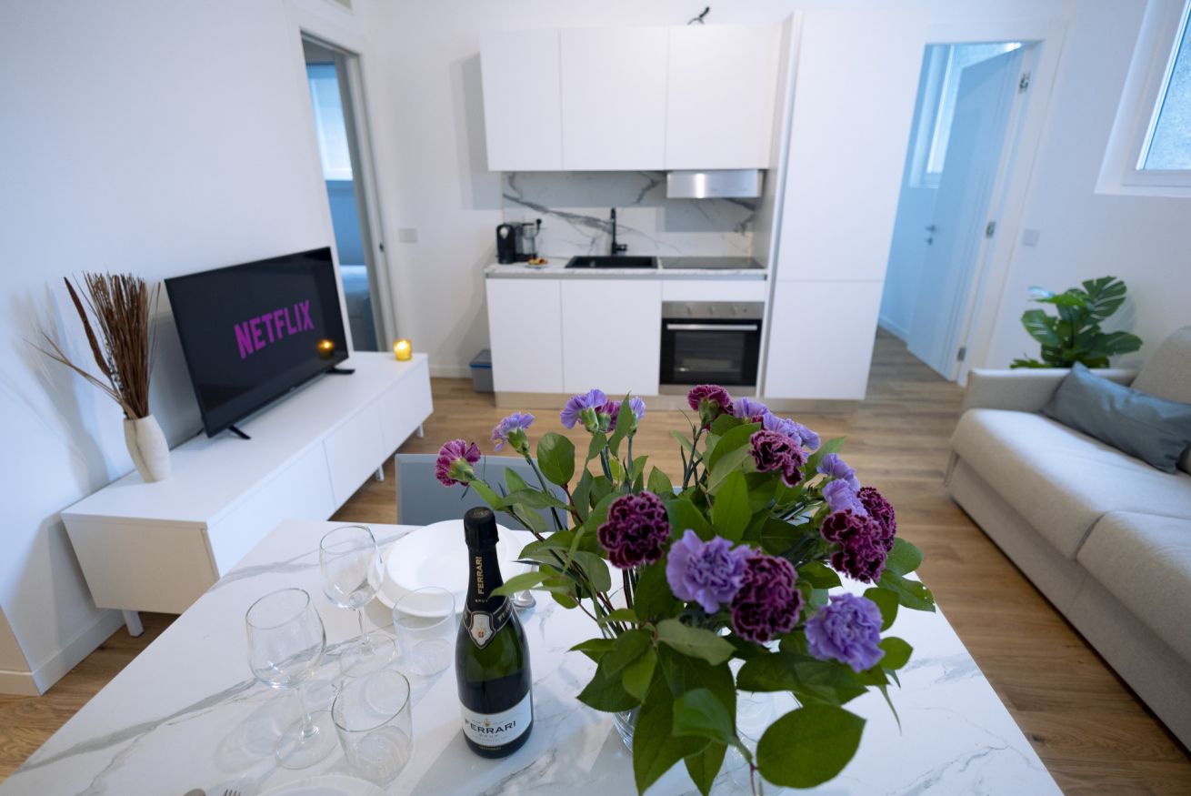 ・Soggiorno con cucina a vista, tavolo da pranzo, tv e divano letto
