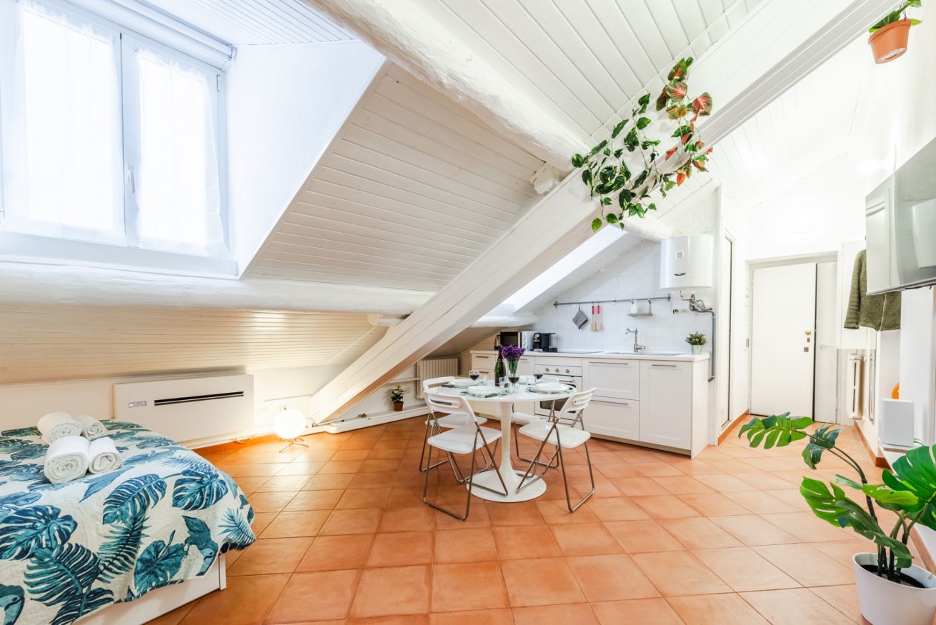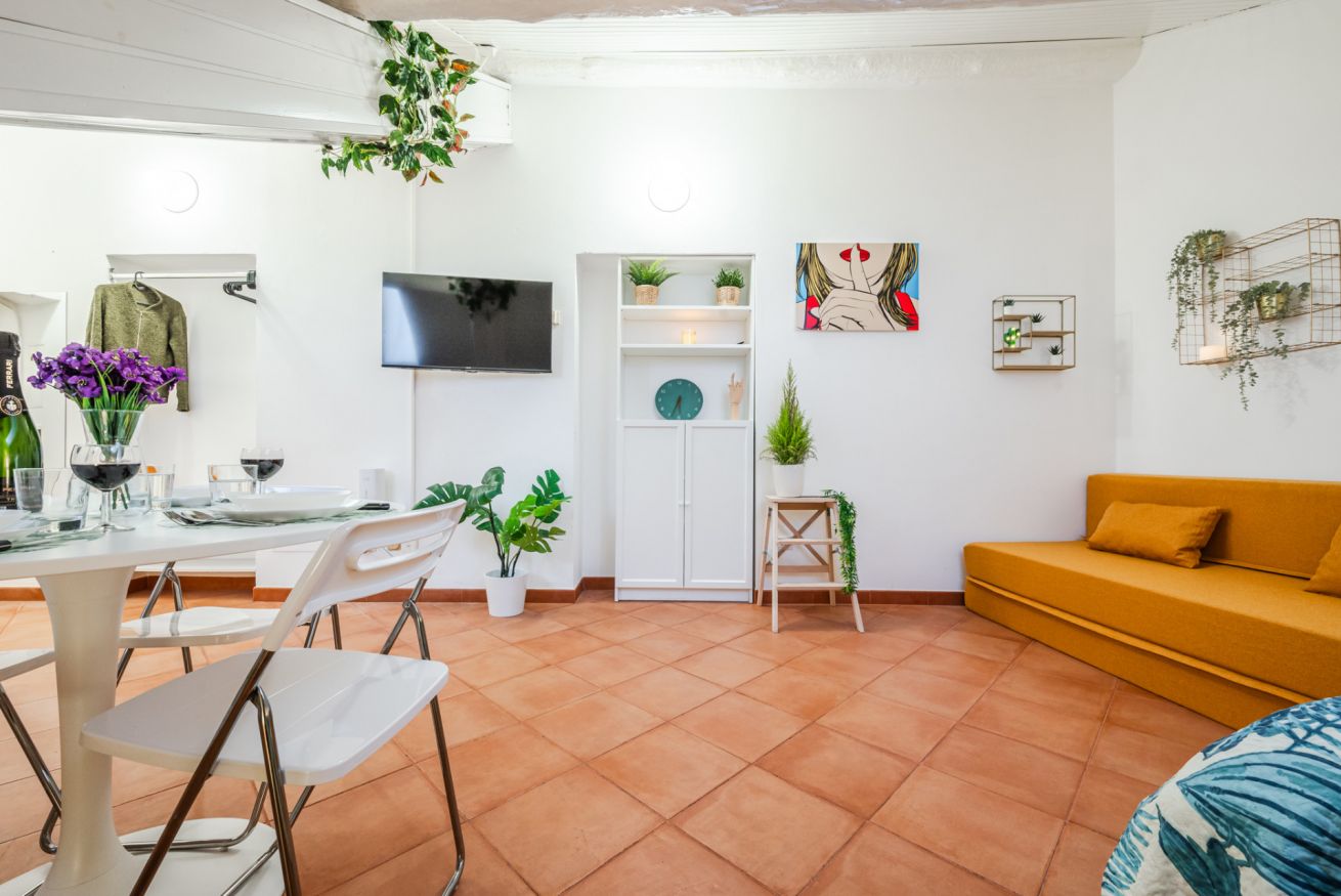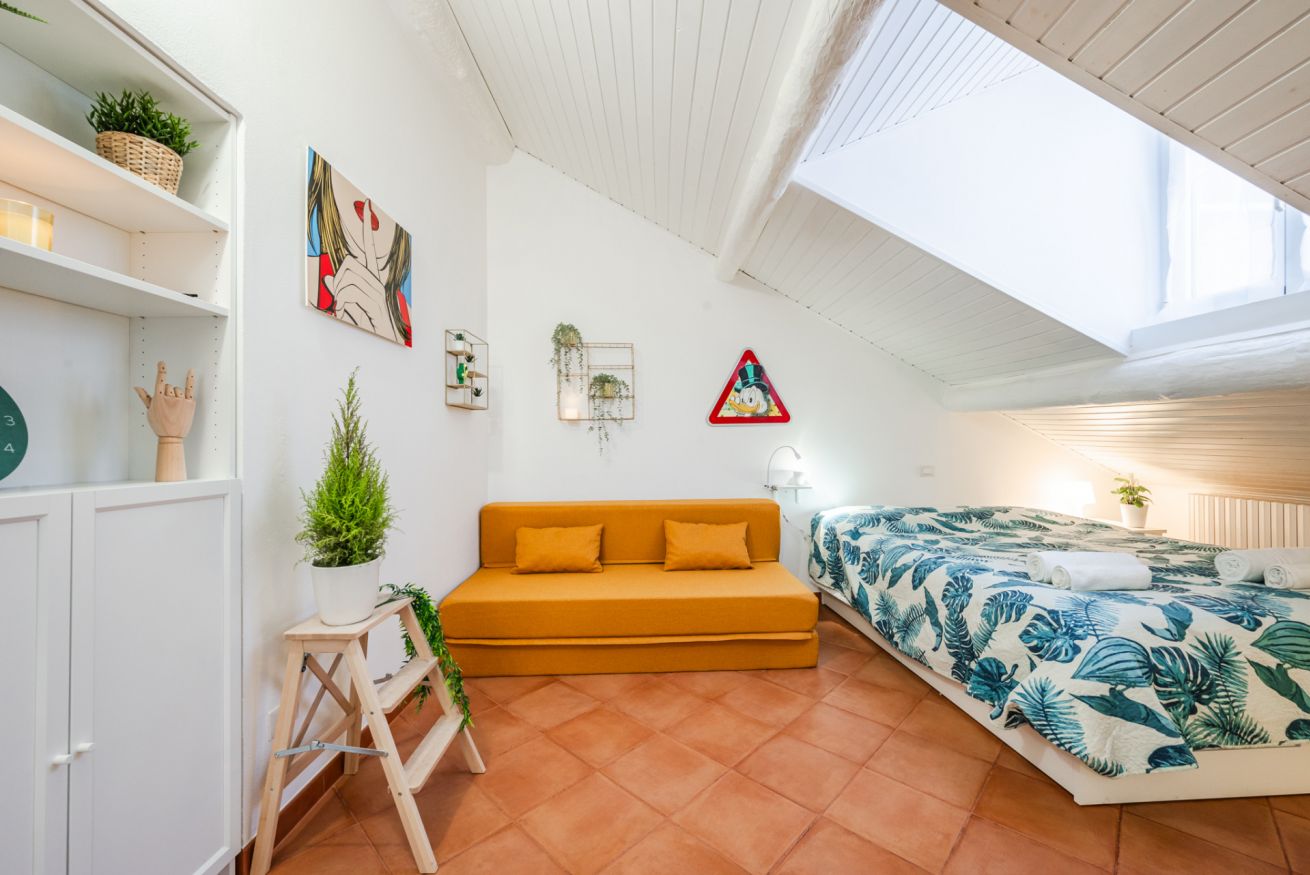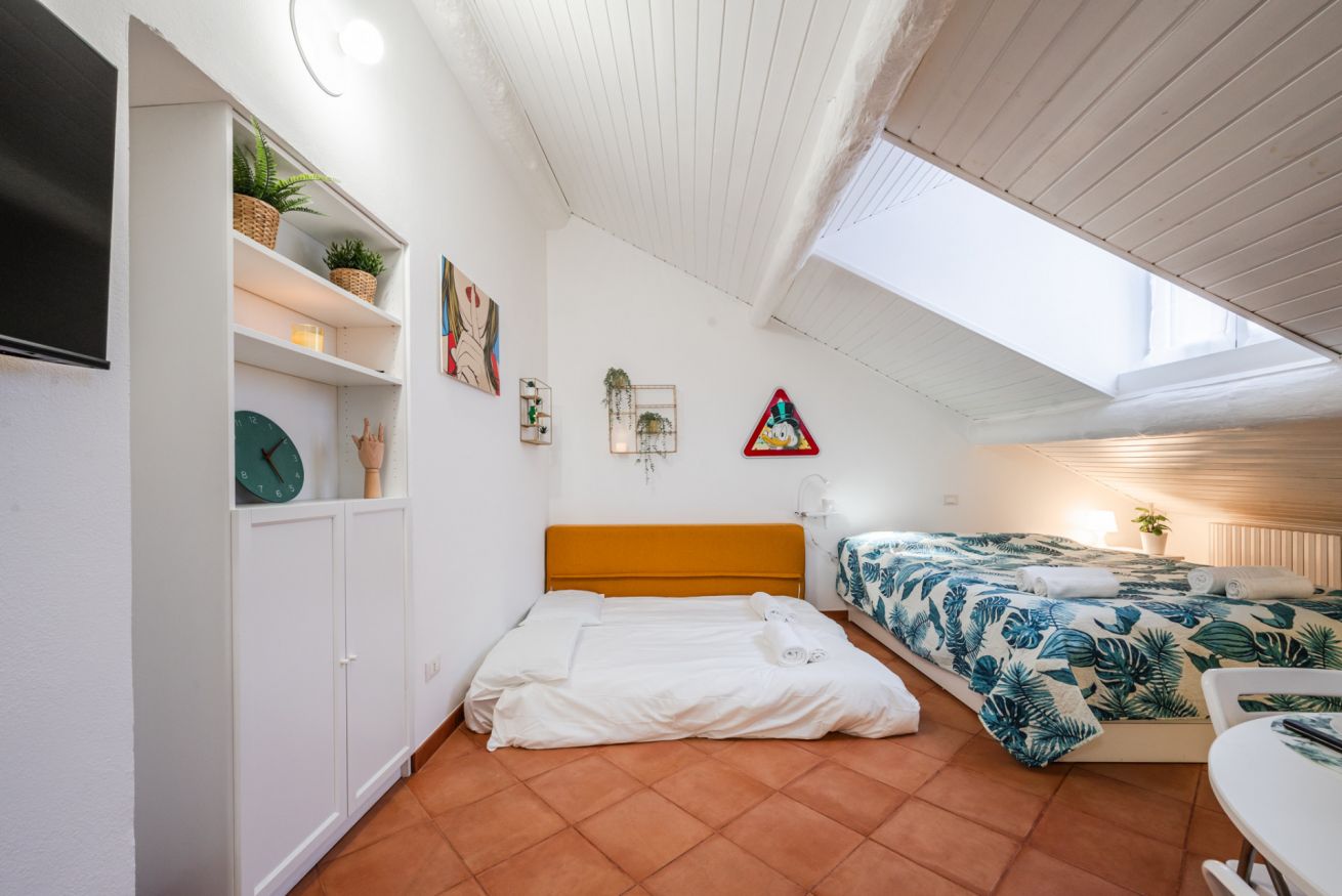 ・Zona giorno-notte con cucina a vista, letto matrimoniale e divano letto